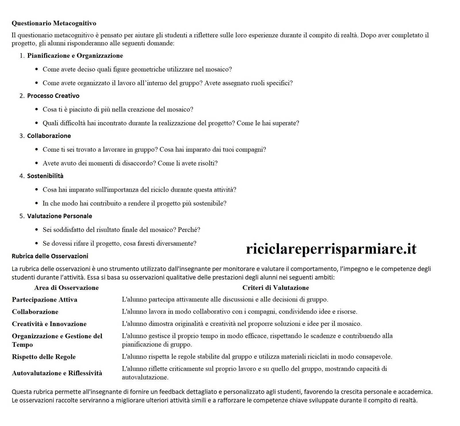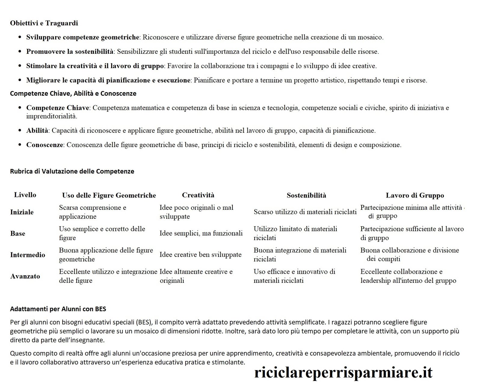 Il compito di creare mosaici con materiali riciclati non solo arricchisce le conoscenze artistiche e matematiche degli studenti, ma li coinvolge in una pratica sostenibile, insegnando loro valori importanti come il rispetto per l’ambiente e la collaborazione. Attraverso questa attività, gli studenti non solo svilupperanno competenze specifiche, ma acquisiranno anche una maggiore consapevolezza del loro ruolo attivo nella costruzione di un futuro più sostenibile.
