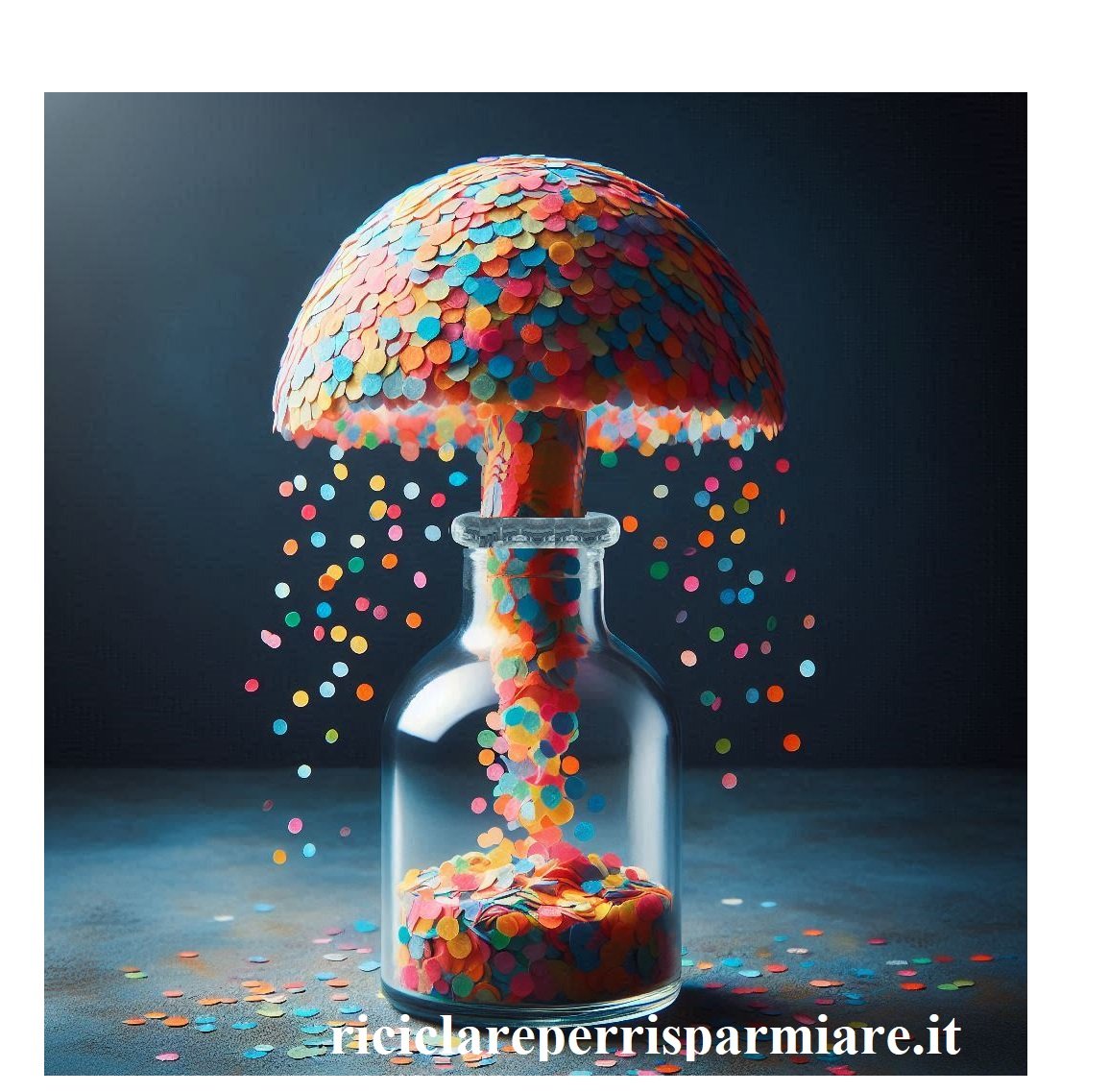 - Procedimento: copri l’apertura superiore della bottiglia con un tovagliolo o carta da filtro. Questa copertura rallenta il movimento dell’aria e permette ai coriandoli di alzarsi più lentamente, formando il “gambo” e poi il “cappello” della nube a fungo.
