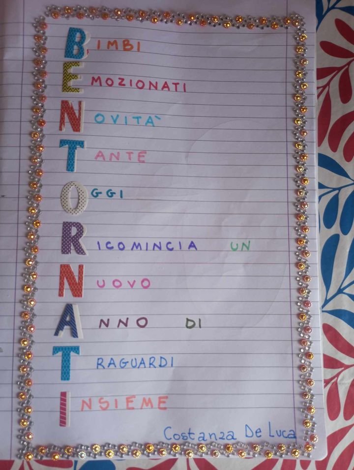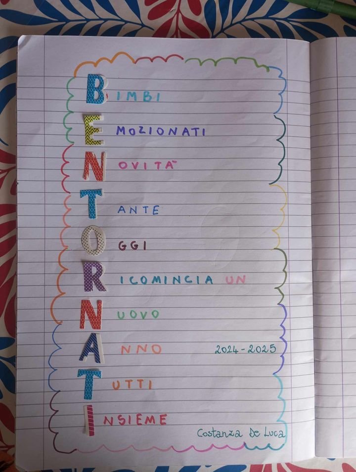 Costanza De Luca ha creato due acrostici con la parola “BENTORNATI”, che catturano perfettamente l’emozione e l’entusiasmo del ritorno a scuola. Questi acrostici non solo celebrano l’inizio di un nuovo anno scolastico, ma lo fanno in modo creativo e coinvolgente.