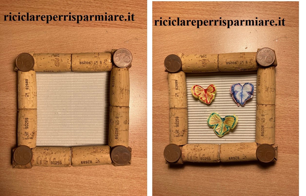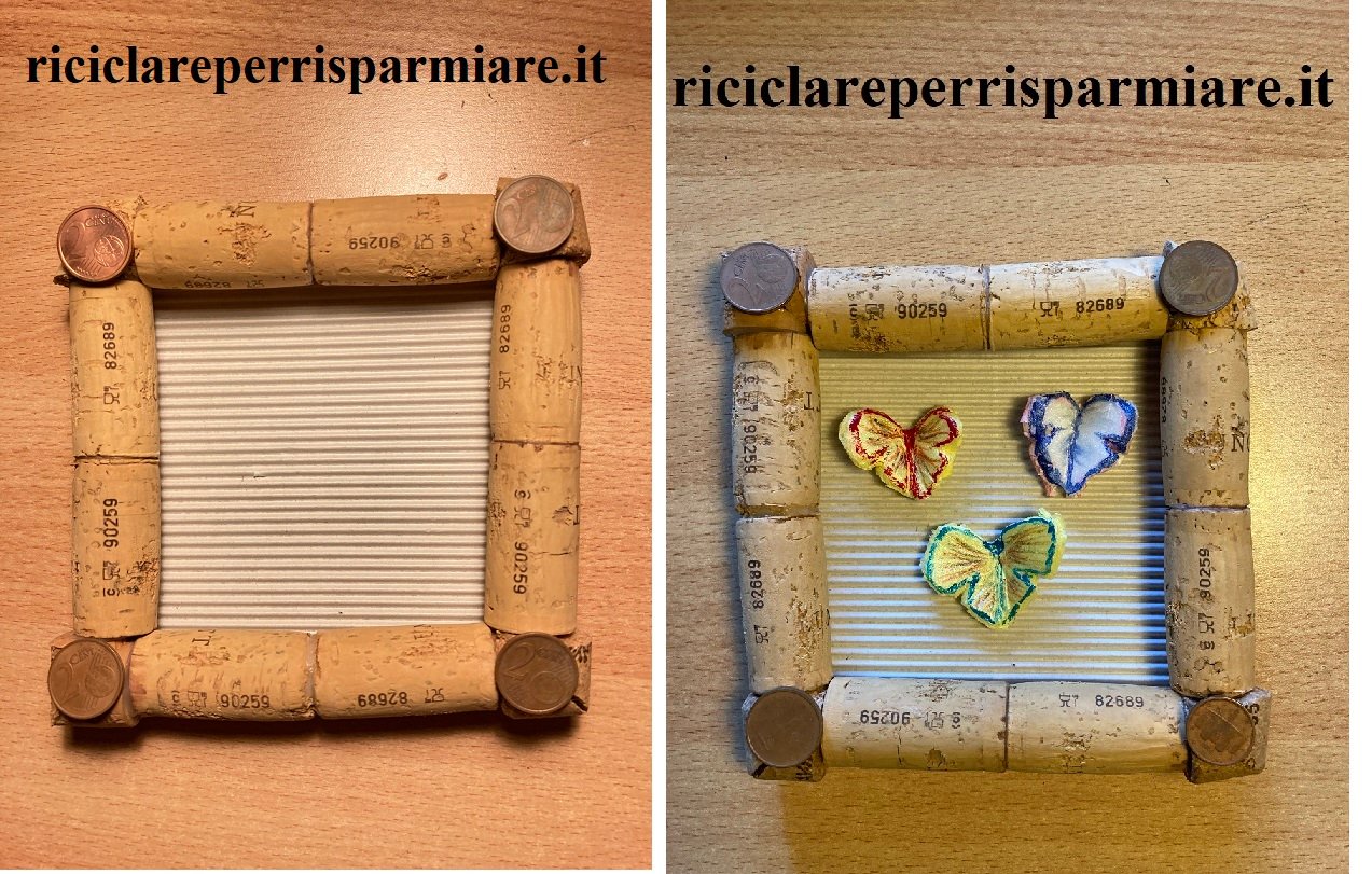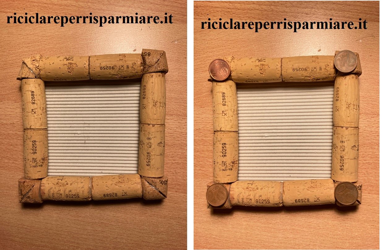 Prepara una cornice quadrata con i tappi di sughero incollati su un cartoncino ondulato. Io ho preso il cartoncino della scatola di biscotti. Poi incolla ai quattro angoli quattro monetine