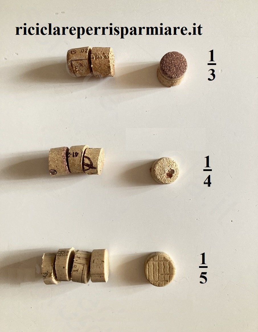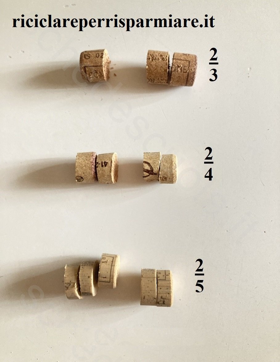 Come creare le frazioni con il sughero e riciclare il sughero dei tappi del vino. Questa attività ci consente di dimostrare ai nostri piccoli discepoli cosa vuol dire suddividere, frazionare in parti uguali un intero. Il frazionamento ci permette anche di indicare le varie parti con il linguaggio matematico.