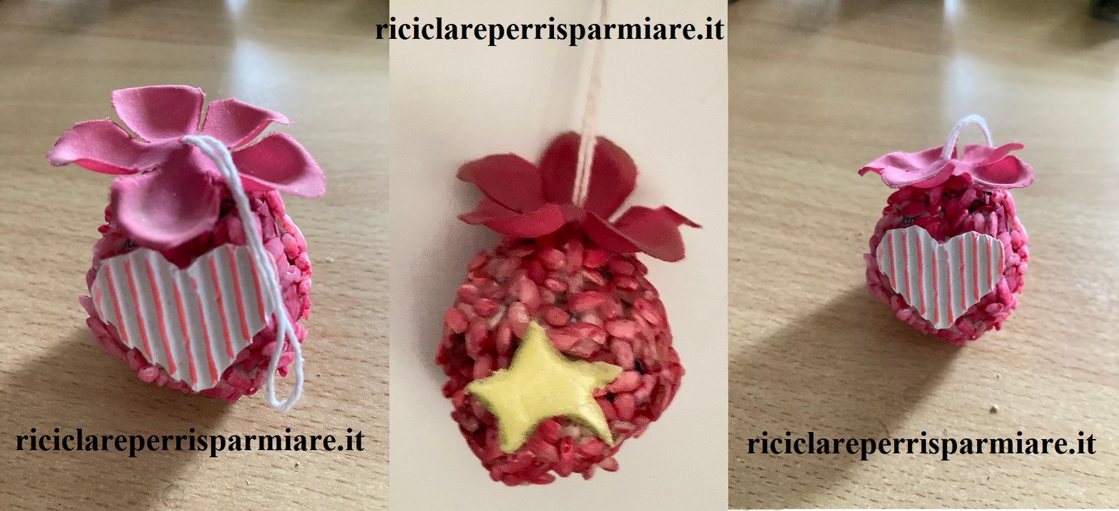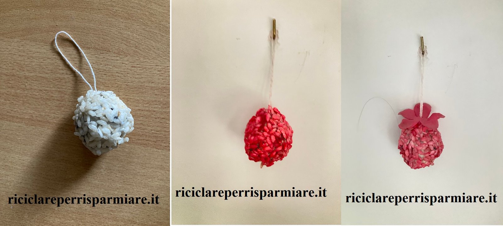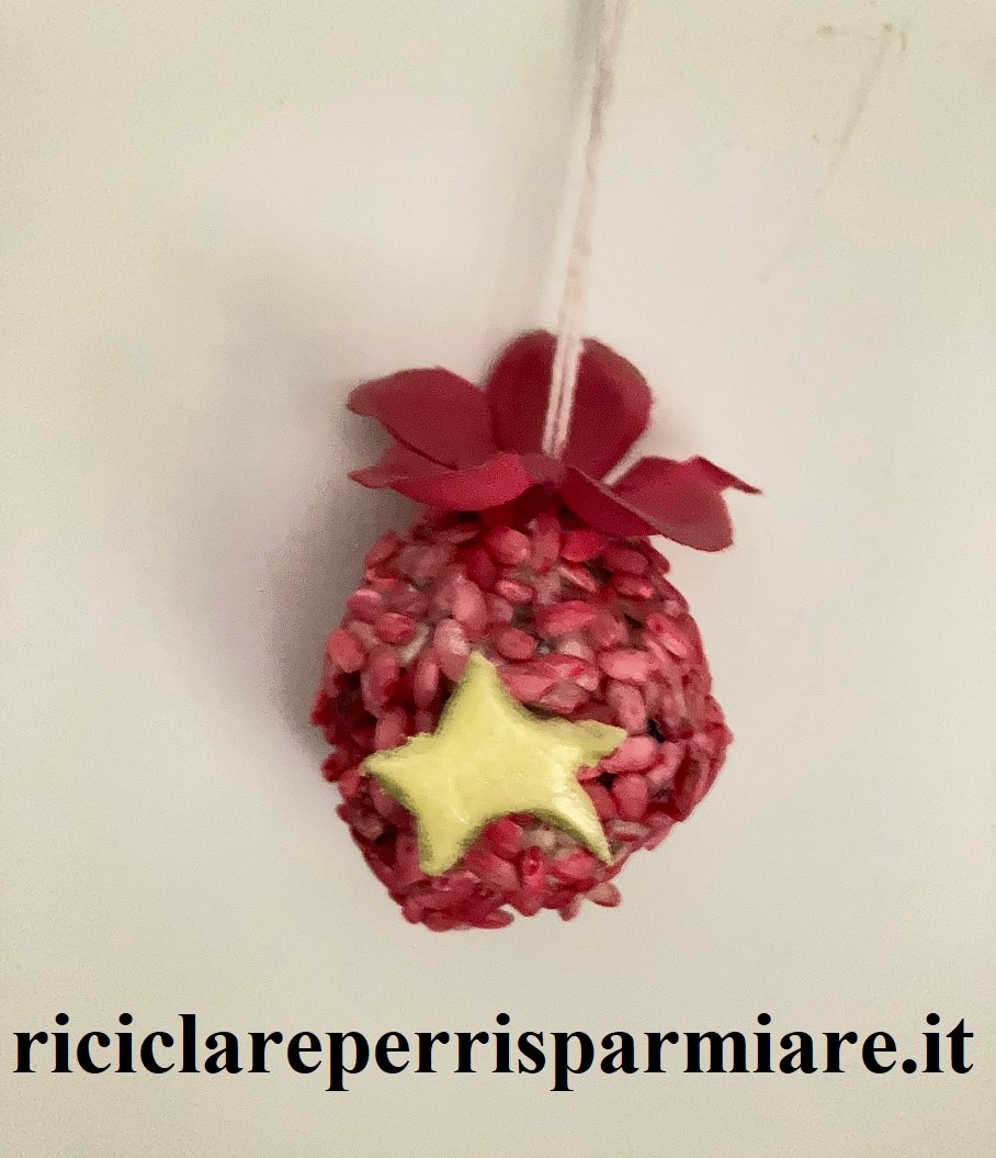 Come creare palline con riso e riciclare riso; crea palline Natalizie con la carta, ricoprile di riso e poi colorale. I bambini saranno ben lieti di collaborare. Ti occorre solo un po’ di carta, la colla vinilica, il riso e i colori rosso, oro, argento…