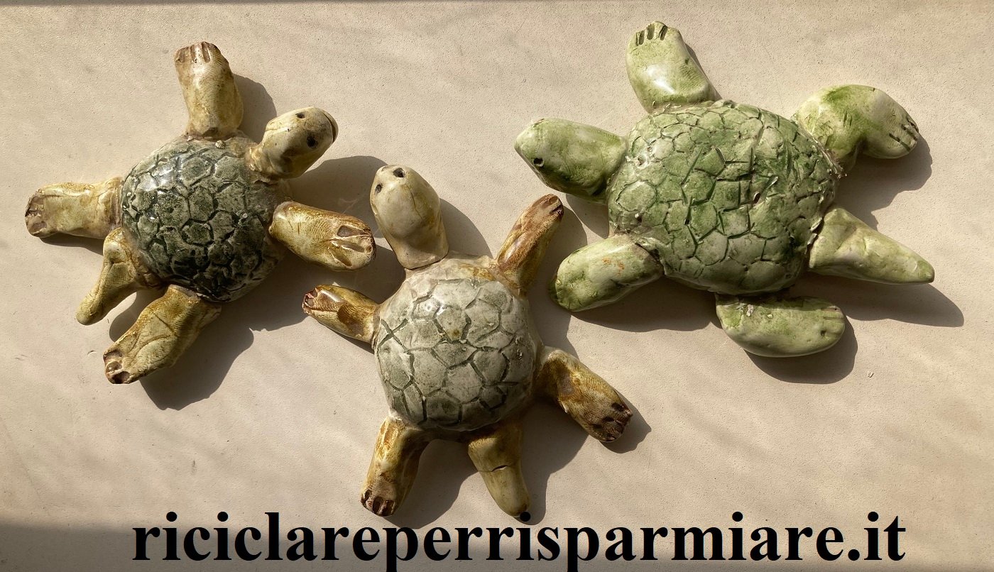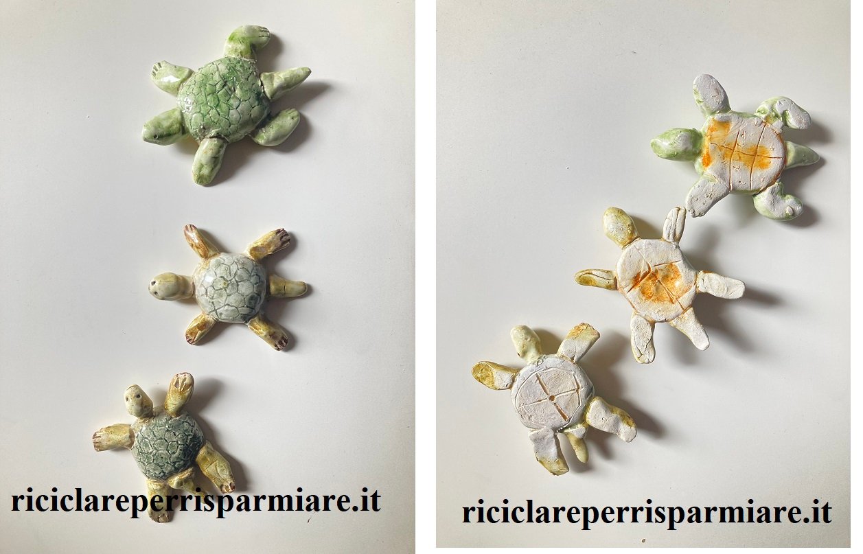 Impasta 200 g farina di mais con 200 g di colla vinilica e due cucchiai di olio vegetale. Impasta e poi sagoma la prima tartaruga. Lasciala asciugare e poi colorala con la tempera. Per finire stendi uno strato di vernidas, per renderla lucida.