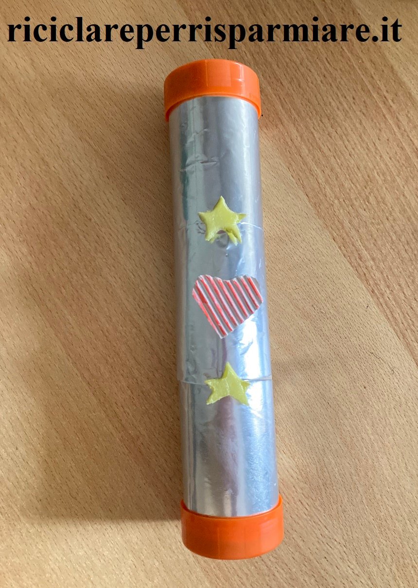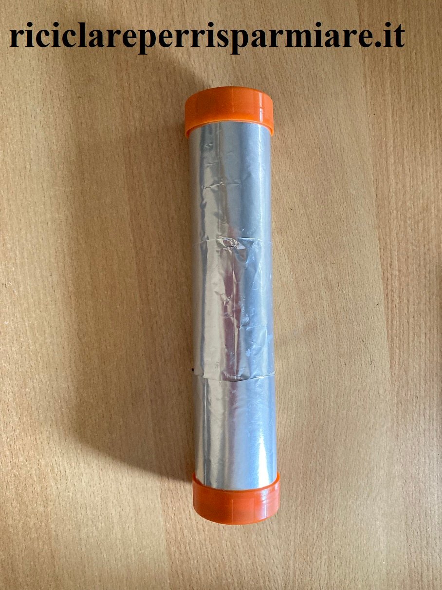 Come creare un tubo contenitore e riciclare cartone; crea un tubo per custodire i tuoi oggetti. La mamma di Maria l’ha usato come custodia per gli spiedini.