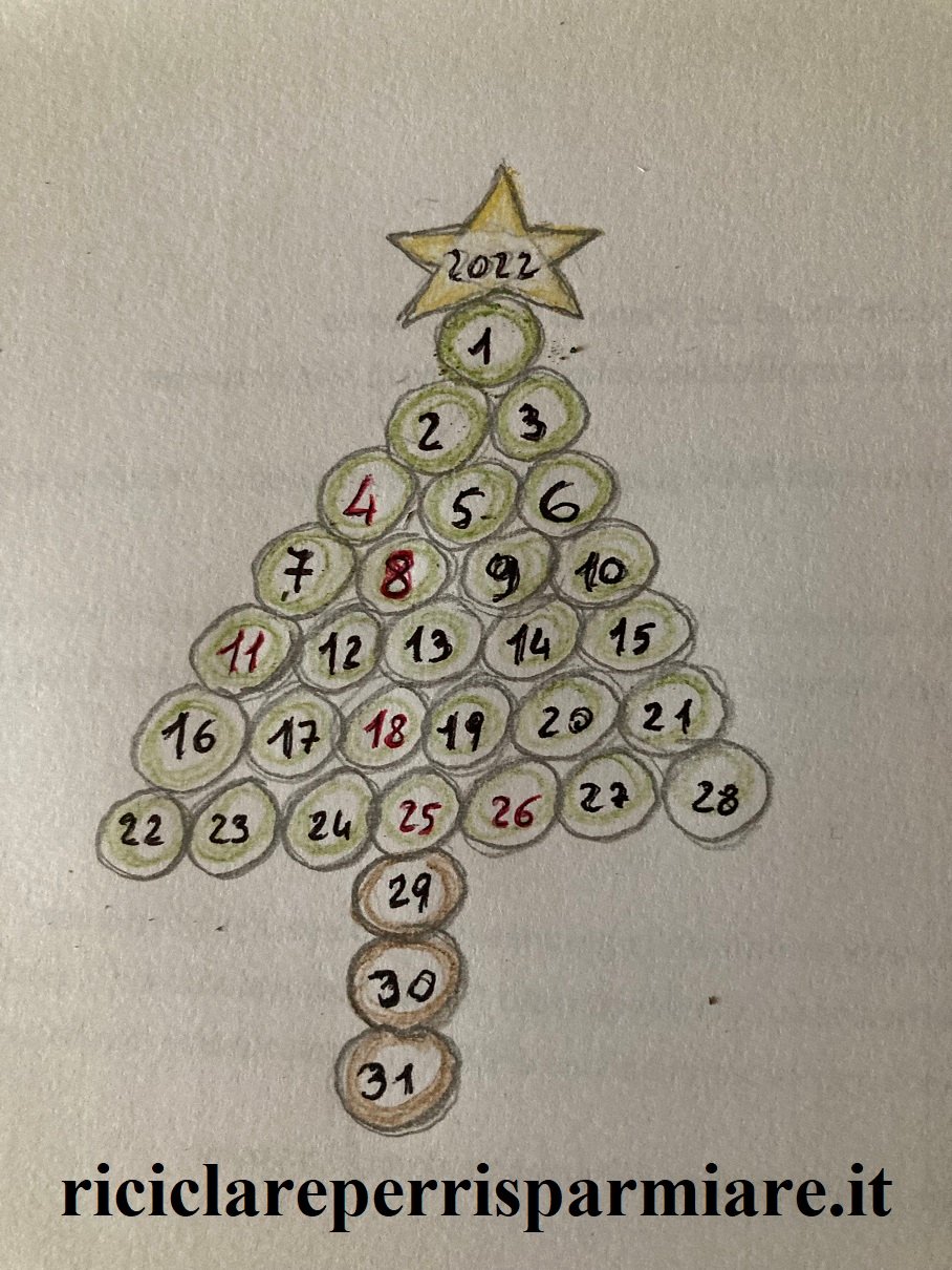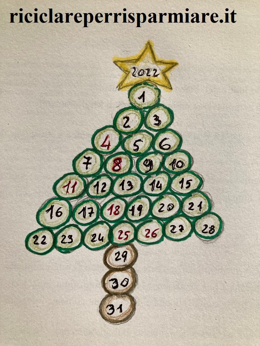 Come creare il calendario di dicembre e riciclare carta. Crea un calendario con i bambini, crea con loro un albero calendario… si divertiranno tantissimo. Il nostro calendario a forma di Albero di Natale ha la stella in cima sulla quale Giorgio ha scritto la data dell’anno in corso. L’albero di Giorgio è formato da 28 cerchietti verdi e tre marroni, ogni cerchietto è un giorno del mese di dicembre: le domeniche e i giorni festivi sono riportati in rosso… insomma… l’Albero di Giorgio è un vero calendario con tutti i trentuno giorni del mese.