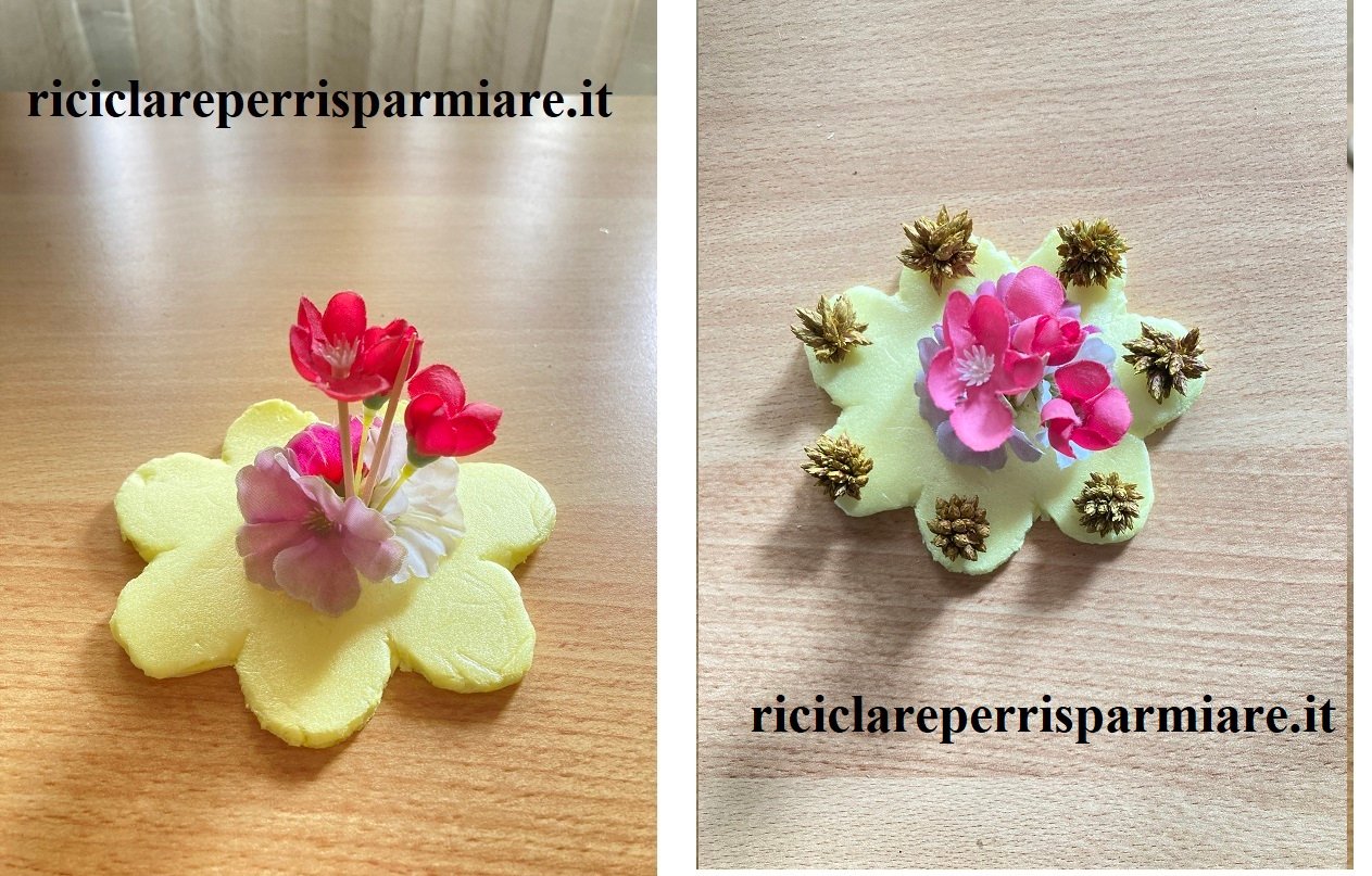 Inizia il tuo centrotavola creando la base di polistirolo, una base smerlata si cui applicare i fiori. Adesso introduci al centro di ogni fiore uno stuzzicadenti e poi infilzare la base, al centro. Dopodiché apporre i fiori secchi sul bordo della base e bloccare tutto con il silicone.