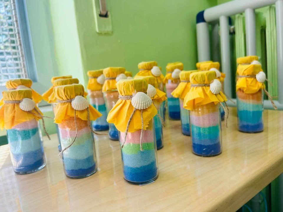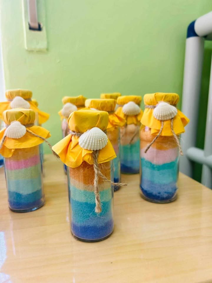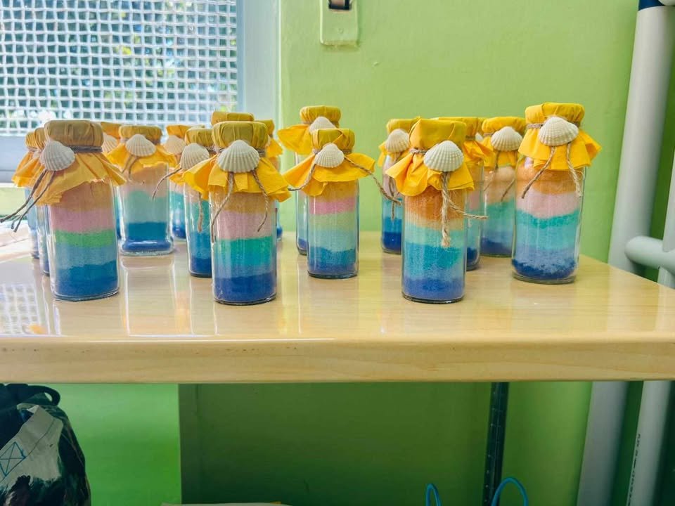 Utilizzando sale grosso e tempere all’interno di bottigliette di plastica riciclate, i piccoli artisti hanno dato vita a bottigliette colorate che ricordano i sette colori dell’arcobaleno. Ogni strato di colore rappresenta un verso della filastrocca, creando una connessione diretta tra la parola e l’immagine.