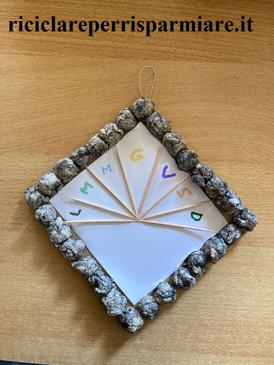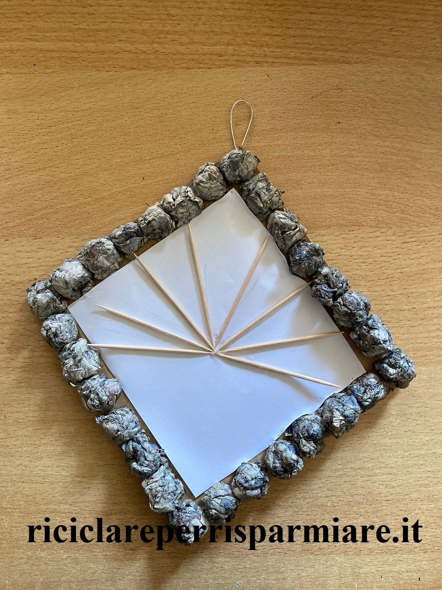 Crea la cornice con i bambini appallottolando la carta intrisa di colla, poi inserisci al suo interno stuzzicadenti e palline di carta.
