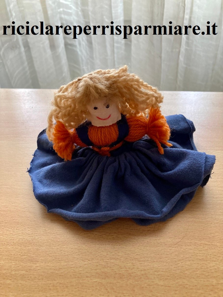 - Preparazione degli Abiti: La gonna della nostra bambola è fatta con un elastico in cotone morbido. Taglia l’elastico alla lunghezza desiderata, ricoprilo con del tessuto da riciclare e poi fissalo intorno alla vita della bambola. Puoi anche utilizzare ritagli di stoffa per creare un corpetto. Incolla i ritagli di stoffa al corpo della bambola con la colla a caldo.