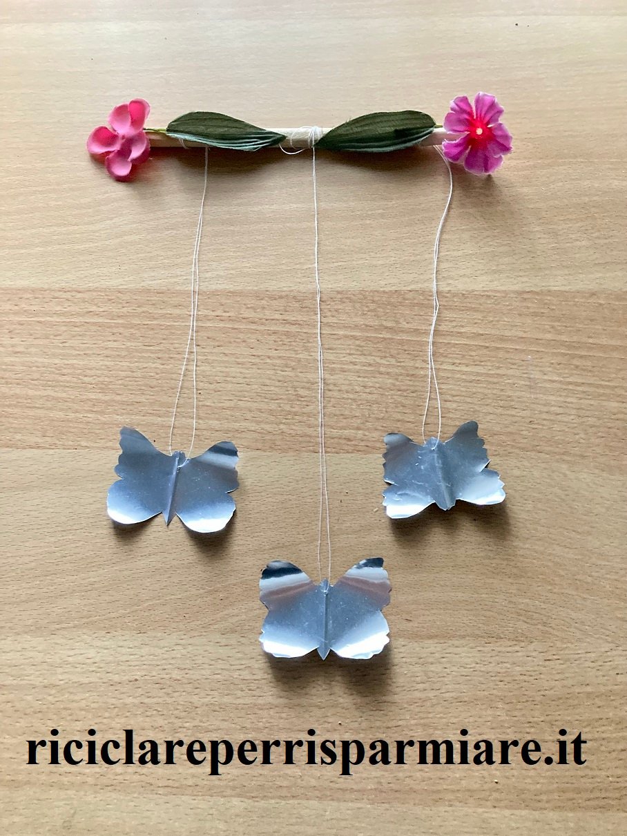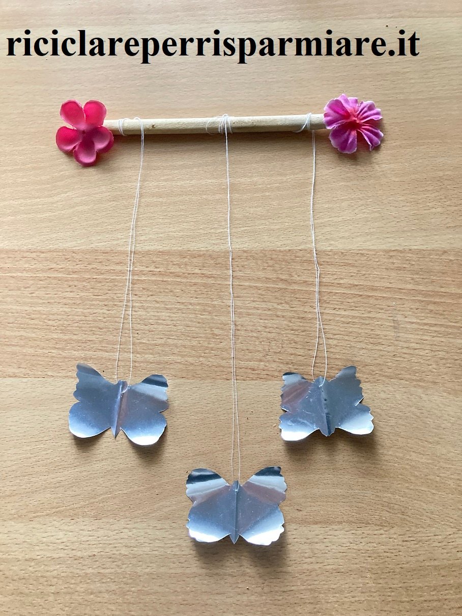 - Una volta che avete creato un numero sufficiente di farfalle, posizionate lo spaventa piccioni sul balcone, sospeso in modo visibile e ben esposto.