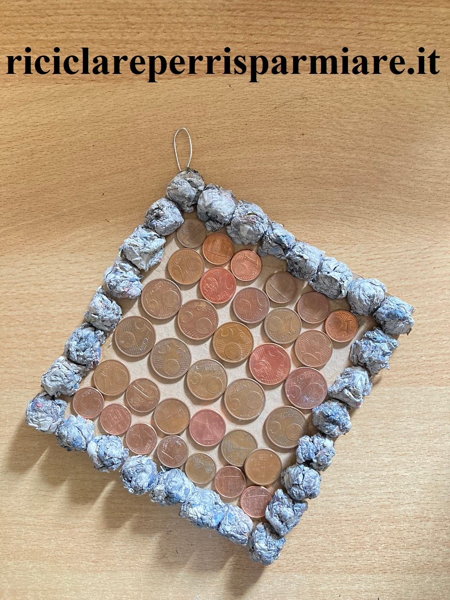 Taglia una pagina del giornale in tante parti uguali. Accartoccia ciascuna delle parti e impregnala di colla naturale. Adesso attacca la carta accartocciata sul perimetro di un cartoncino e lasciala asciugare. Dopodiché inserisci le monete da 1, 2 e 5 centesimi.