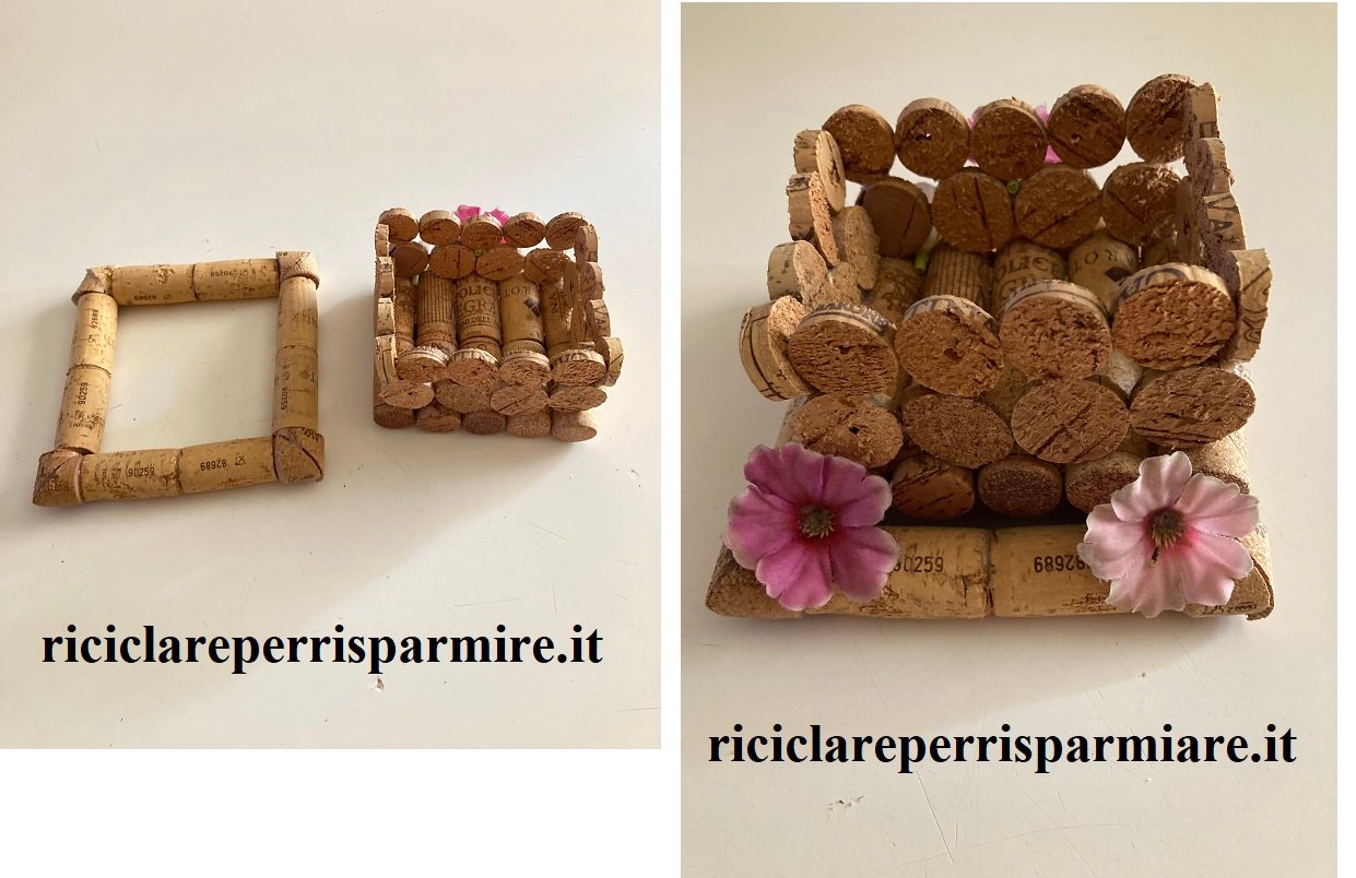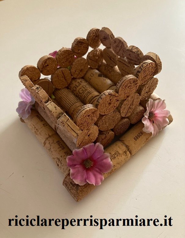 Adesso crea un quadrato di tappi e poggia il cestino sul quadrato. Infine decora il cestino come vuoi; noi nel prototipo abbiamo adoperato quattro fiorellini colorati.