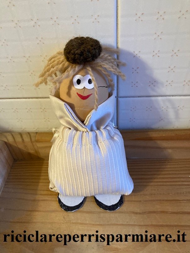 Per creare Coco con i bambini occorre un sacchetto di stoffa, ovatta q. b. per riempire il sacchetto, il guscio di un uovo per realizzare la testa del personaggio, alcuni fili di lana per i capelli e per il cappellino, una cannuccia di 15 cm. per fissare la testa al sacchetto.
