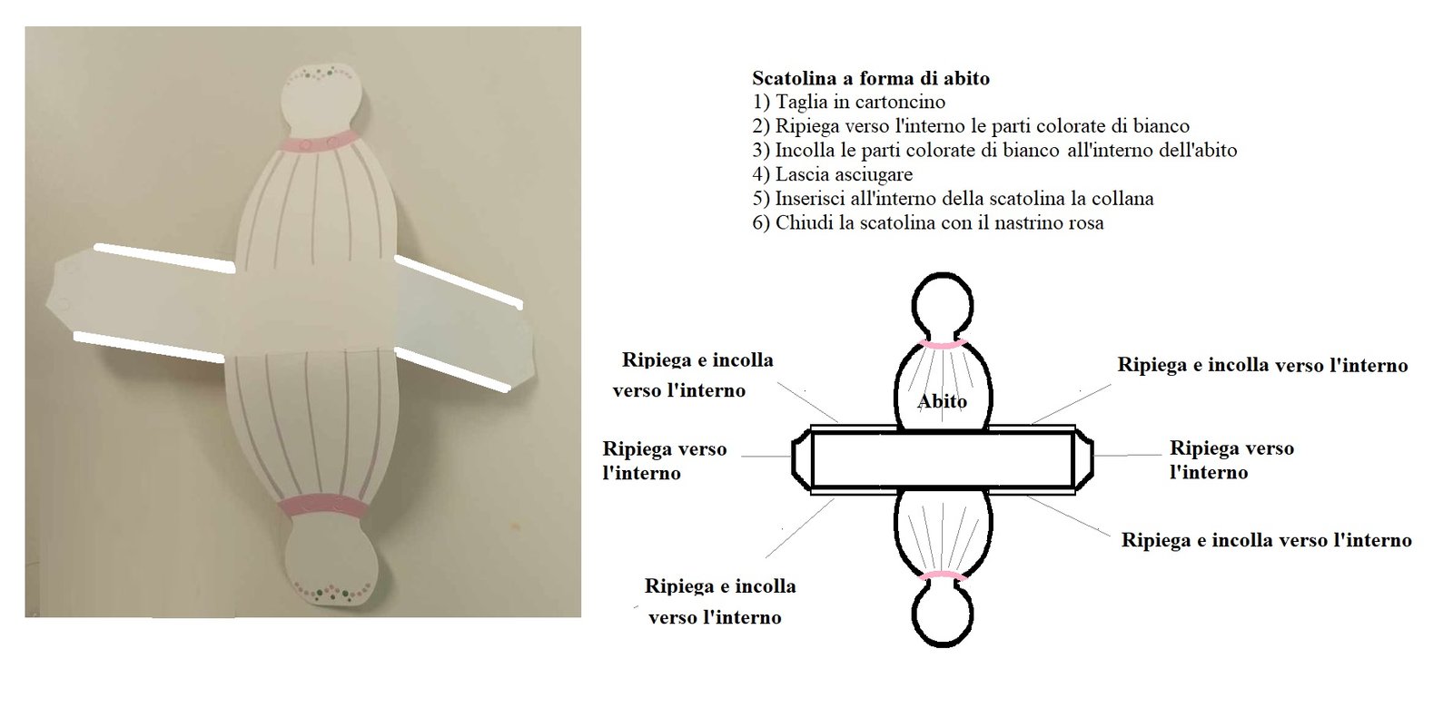 - Confezionamento: Le collane saranno confezionate in scatoline a forma di abito. I bambini hanno seguito le istruzioni per assemblare le scatoline, rendendo il regalo ancora più speciale.