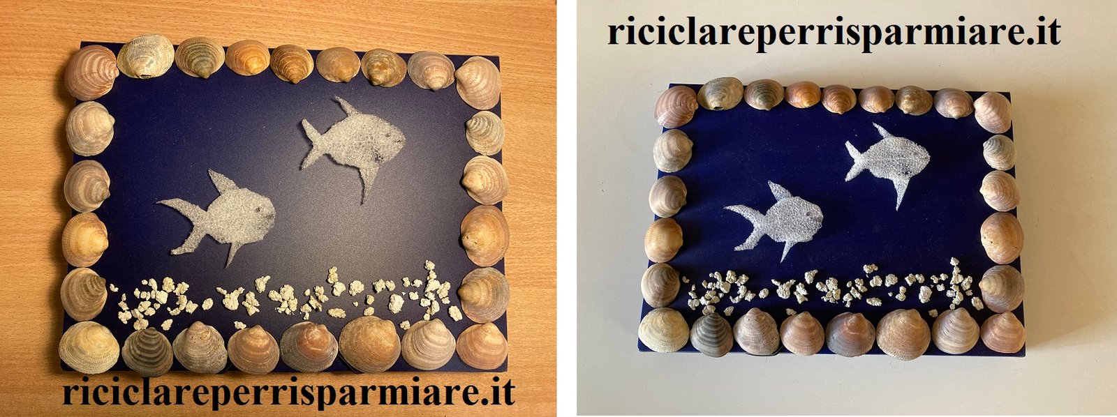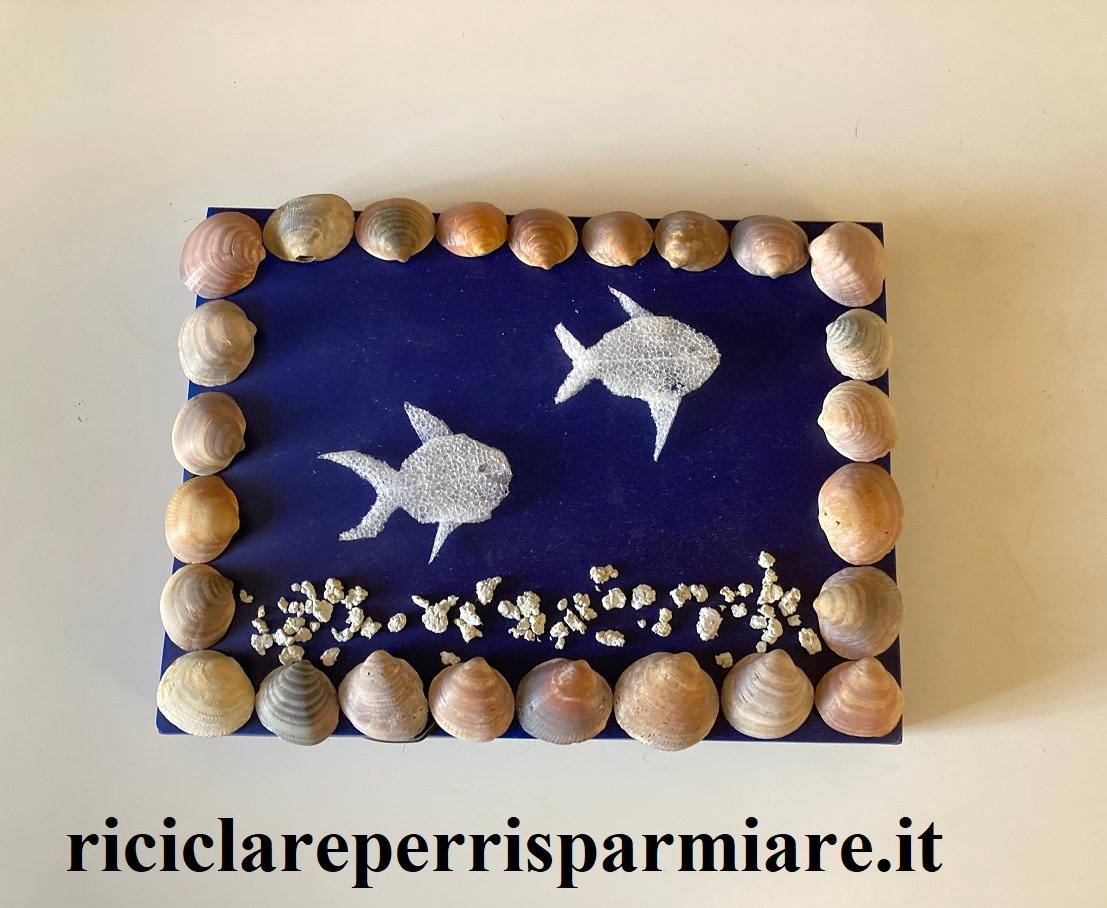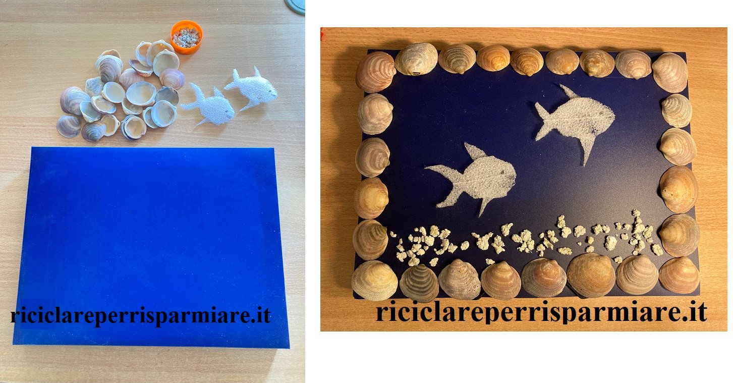Ho preparto la composizione con Giulia, incollando le conchiglie sul bordo su un foglio di compensato. Il bordo è così diventato la una cornice. Sulla base, internamente alla cornice, abbiamo distribuito alcune palline di carta intrise di vinavil. Per finire abbiamo preparato i pesci di spugna che abbiamo fissato con una goccia di silicone trasparente.