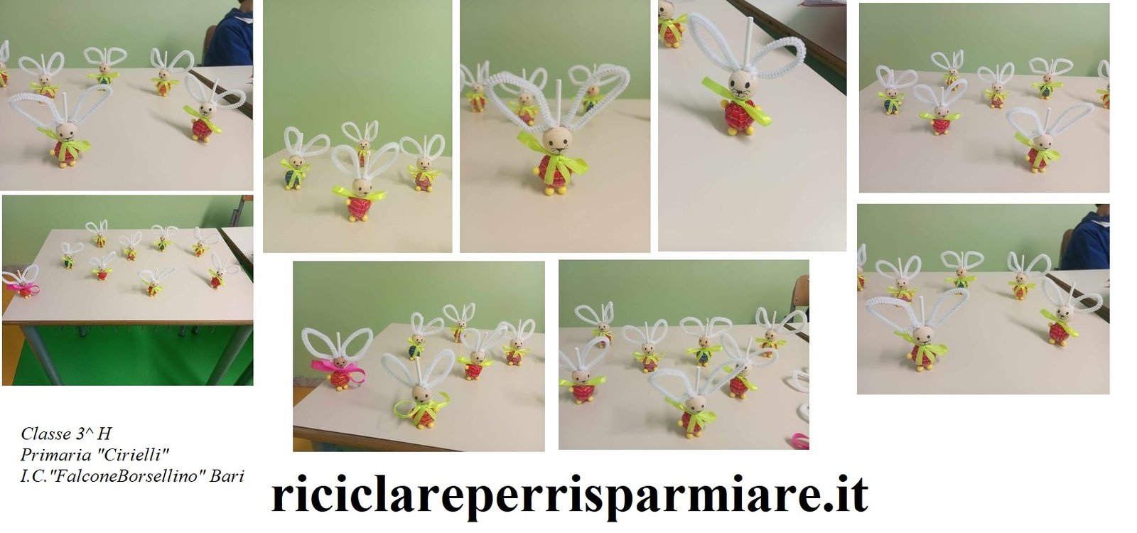 Nella vivace aula della Classe 3^ H della Scuola Primaria “Cirielli” presso l’I.C. “Falcone-Borsellino” a Bari, si è svolto un laboratorio creativo che ha portato alla realizzazione di adorabili coniglietti. I bambini hanno dimostrato grande entusiasmo e abilità nel creare queste simpatiche creature pasquali.