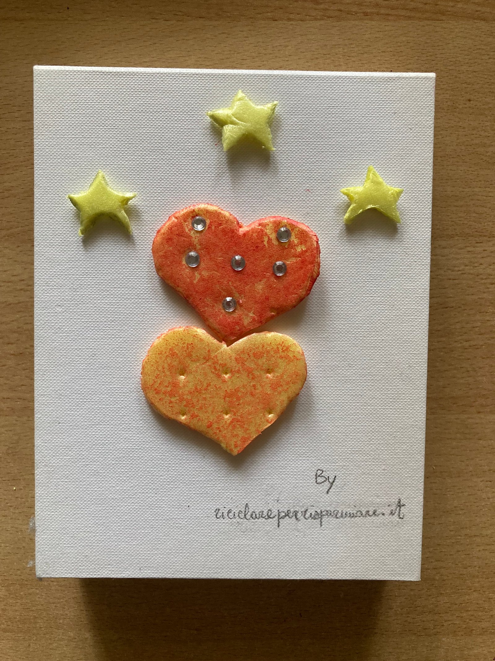 Predisponi due cuori di polistirolo e colorali con tonalità diverse. Applica gli strass solo su uno dei due. Poi prepara tre stelline ed incolla tutto sul coperchio della scatola di cartone.