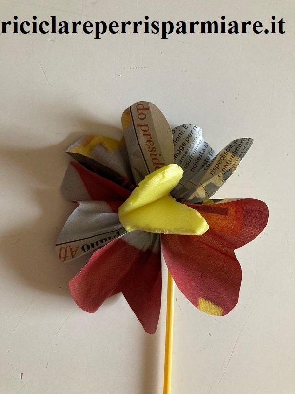 Come creare un fiore di carta per riciclare una rivista, cioè una idea fiore i cui petali sono fatti con una pagina della vecchia rivista.