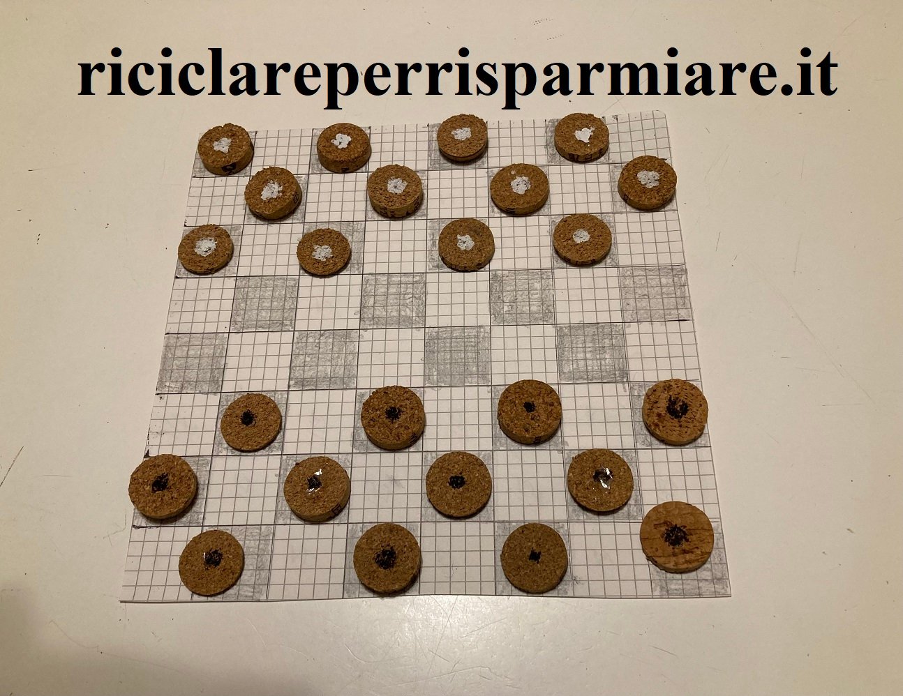 Come creare il gioco della dama e riciclare tappi. Crea il gioco con i bambini. A tal fine prepara la scacchiera con il cartone e poi le pedine con i tappi di sughero.