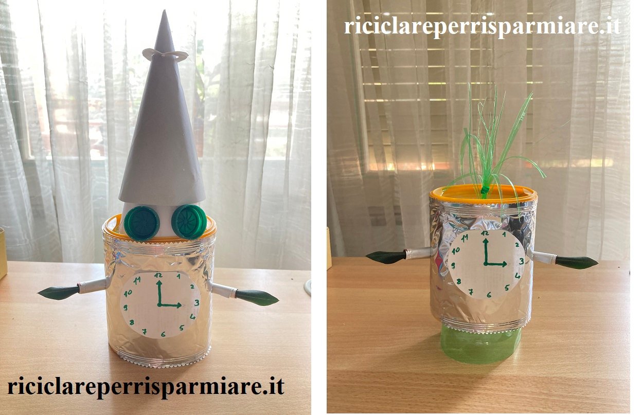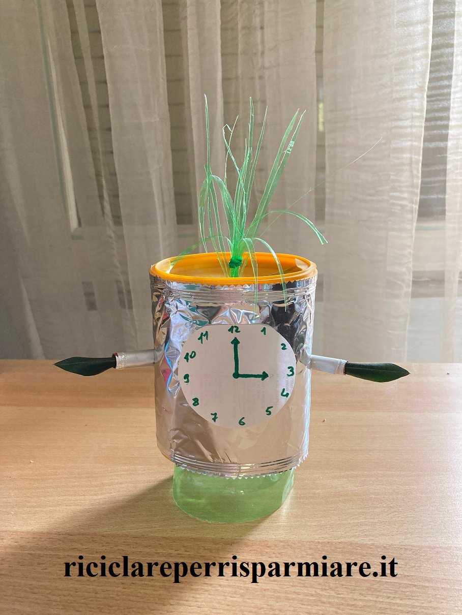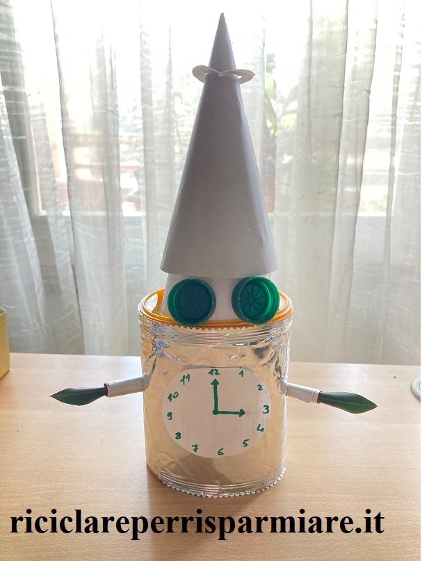 A tal fine procurati una scatola cilindrica, buca la sua parte laterale alta, per introdurvi due cilindretti che simboleggiano le braccia. Poi ricoprila con l’alluminio dei sacchetti che racchiudono le cialde di caffè. Adesso prepara due coni di carta con la medesima base ma con diversa altezza, poi incollali entrambi in cima, sul coperchio della scatola, uno sull’altro, lasciando ben visibile una fascia del cono più alto. Incolla due tappi di plastica sulla fascia. Adesso inserisci le braccia e poi l’orologio. Nel vano di ciascuno dei due cilindretti laterali introduci una foglia d’ulivo. E poi decora il tuo robot con quel che più ti piace.