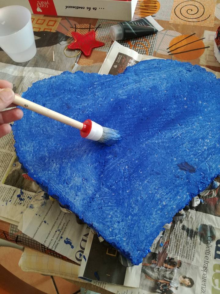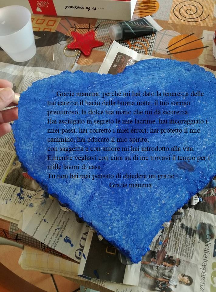 Il nostro è stato un lavoretto semplice e anche scorrevole; l’abbiamo portato a termine senza difficoltà. Abbiamo preparato un cuore di polistirolo; poi l’abbiamo dipinto di azzurro cielo, etereo come la sua bellezza. Dopodiché, una volta asciugato, sul retro abbiamo messo un po’ di scotch biadesivo.