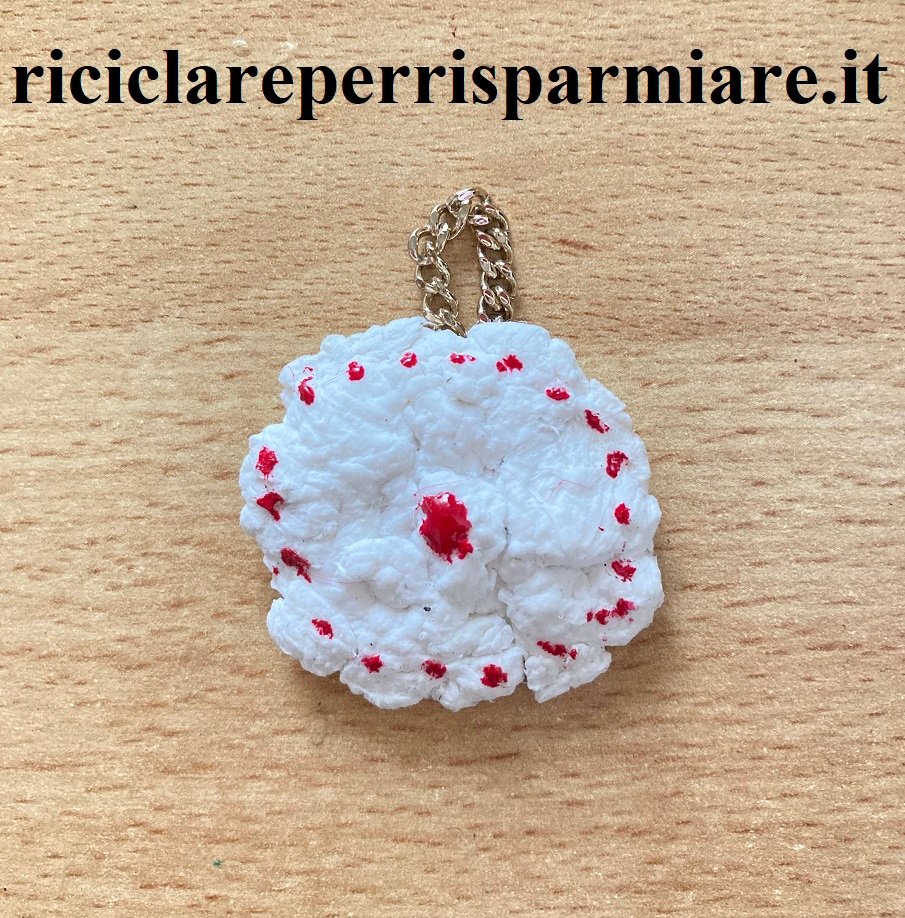 Come creare un pendaglio con smalto e riciclare smalto. Crea con i bambini un pendaglio da mettere al collo, adoperando quaderni da cestinare, poi decoralo con lo smalto. Io e la piccola Adele abbiamo decorato il suo pendaglio con lo smalto rosso. Abbiamo anche creato l’occhiello in cui passare il laccetto. Il nostro occhiello è una catenella recuperata da una vecchia giacca della mamma.