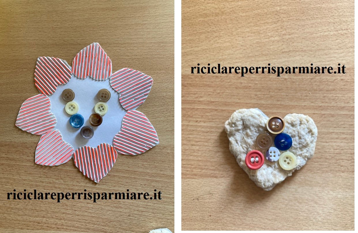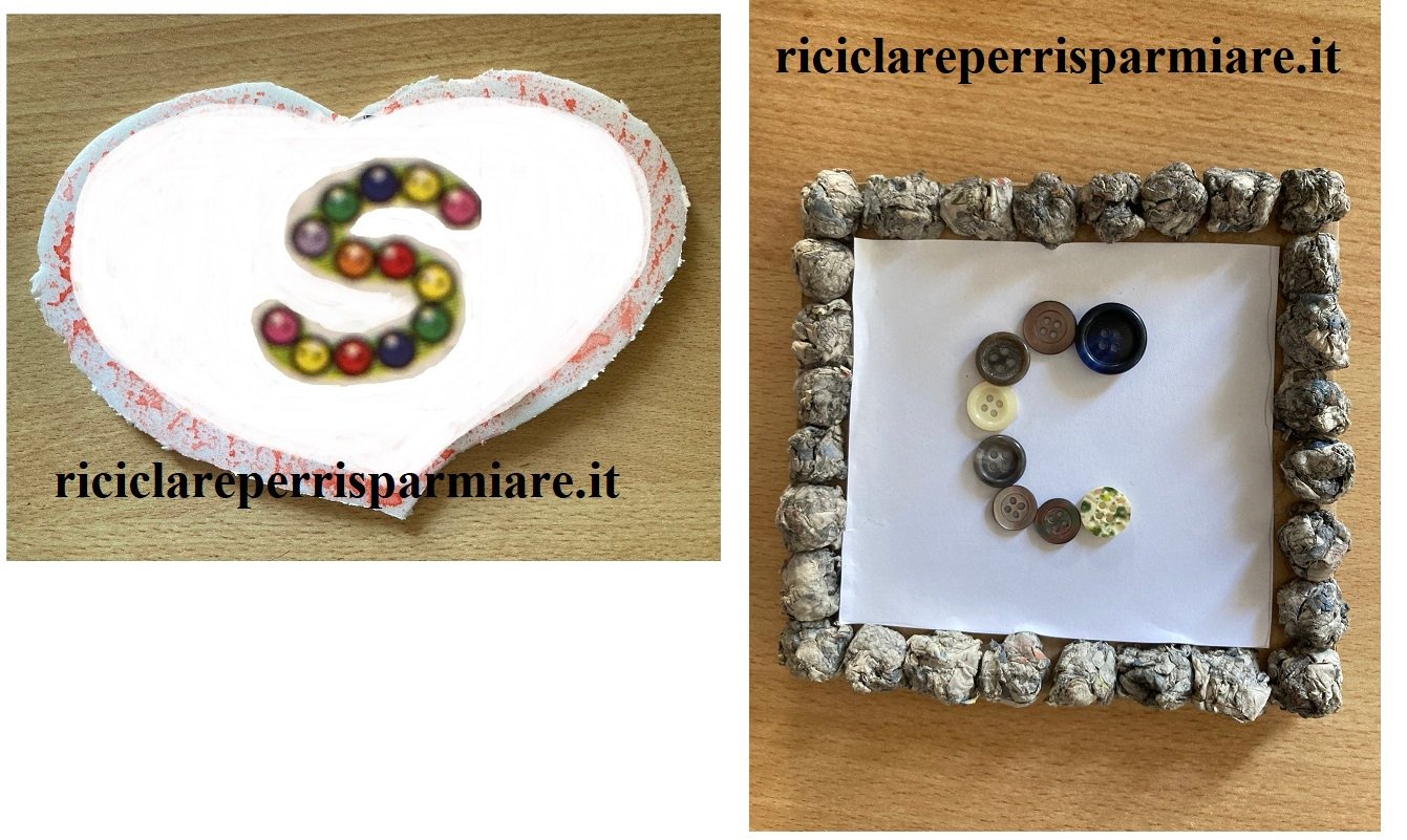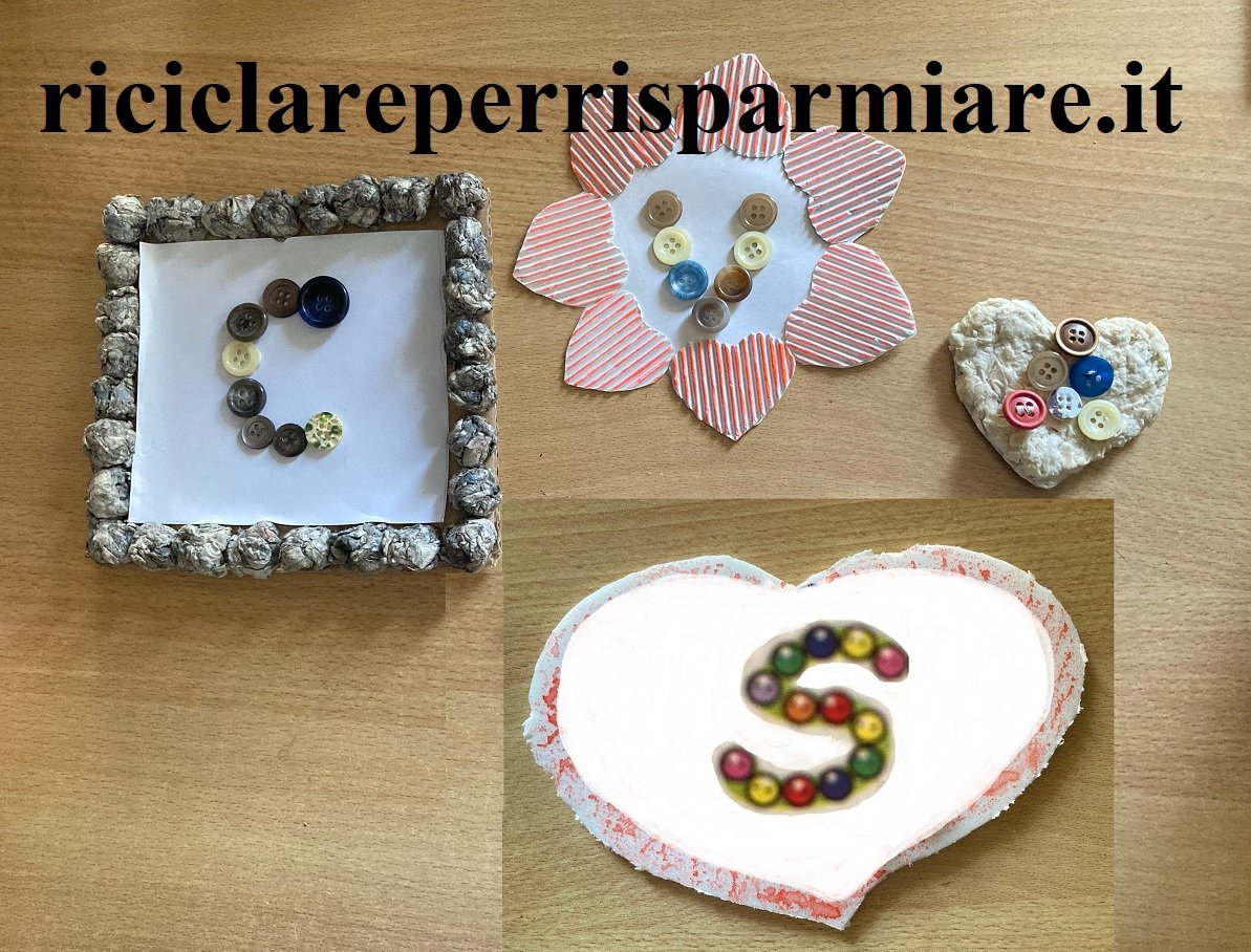 Prepara una cornice di cartoncino con la cornice fatta con la carta dei quotidiani o con il sughero o con altro materiale che hai in casa. Sul cartoncino si disegna la sagoma dell’iniziale del nome della mamma e poi riempi la sagoma incollando i bottoni. Sarà un vero trionfo.