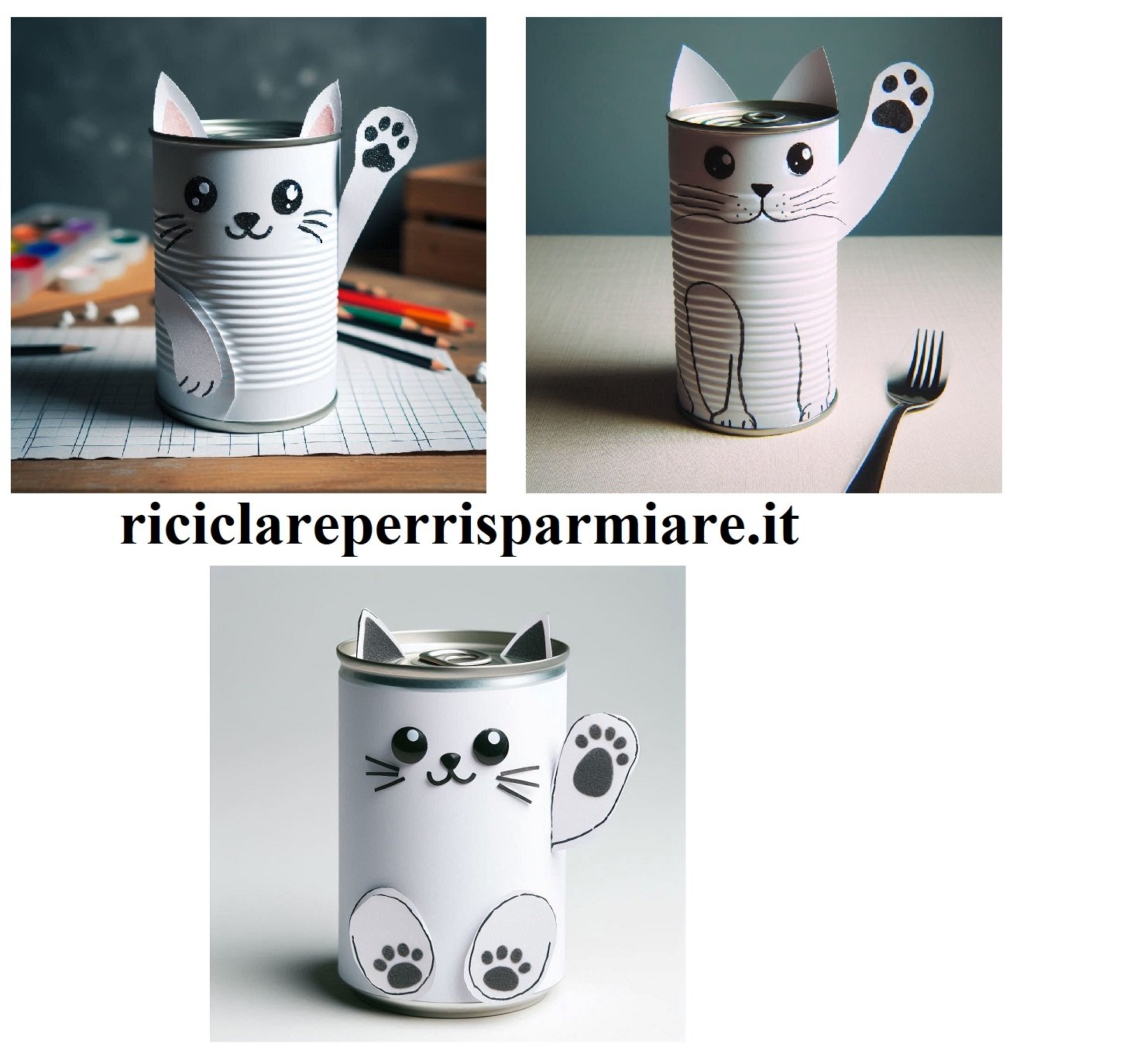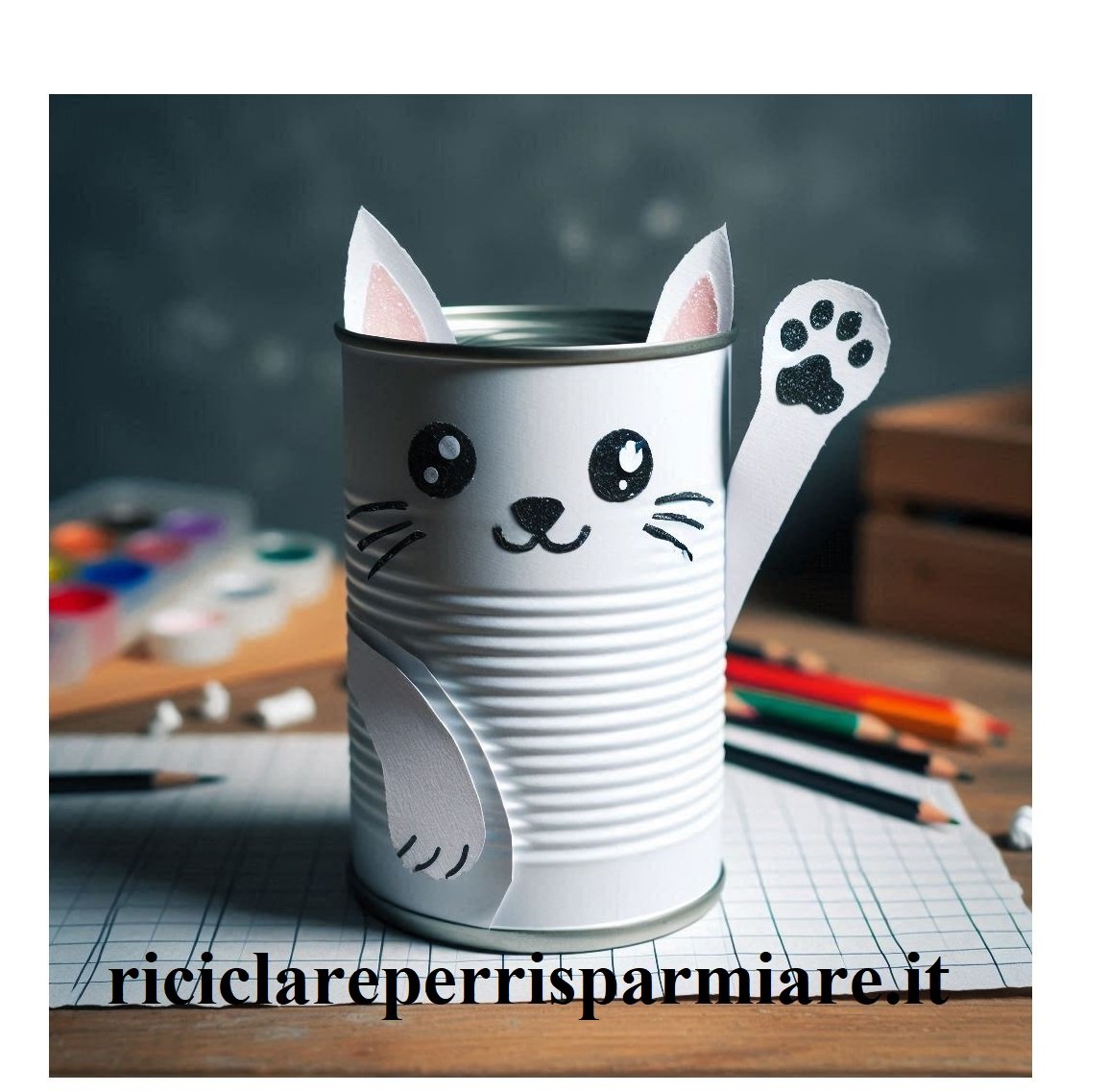 - Ritaglia due triangoli di cartone per le orecchie e incollali sulla parte superiore del barattolo. Decorali con colori o ritagli di riviste.