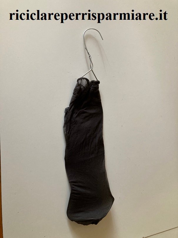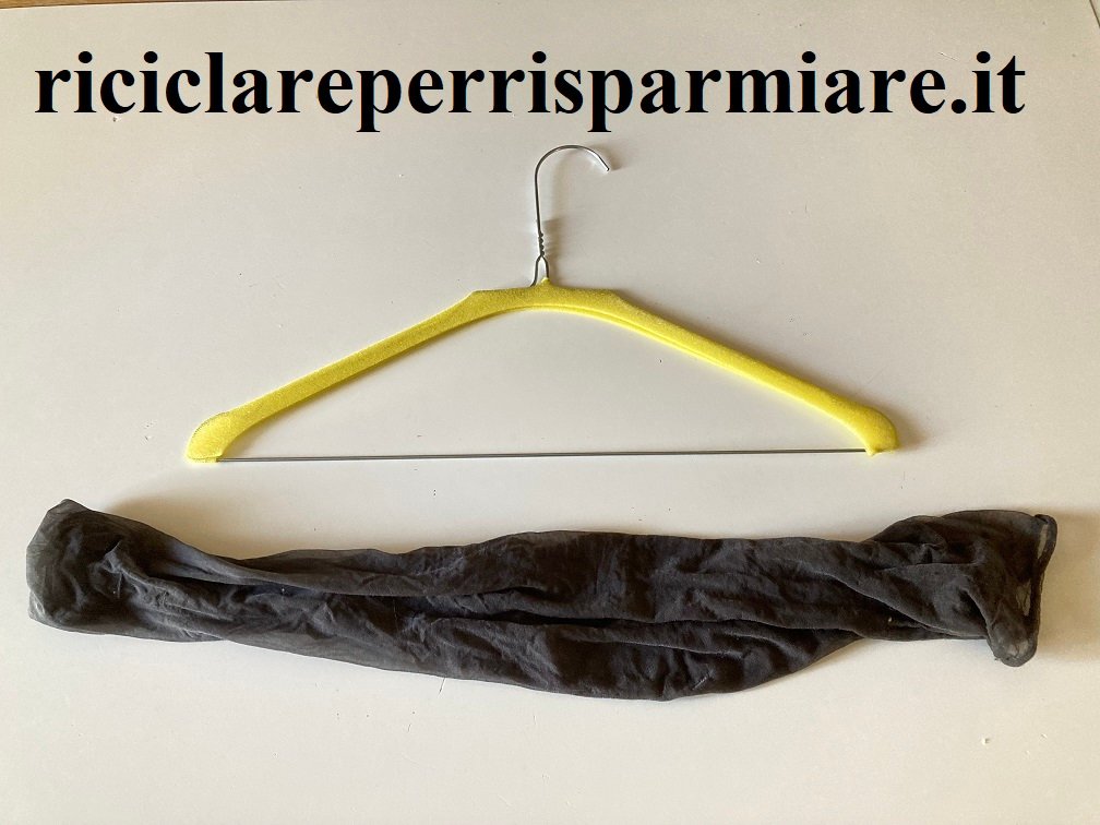 Deforma la gruccia in modo che diventi un’asta stretta, della larghezza e della lunghezza che ti occorre, poi inseriscila nel collant e … il gioco è fatto!