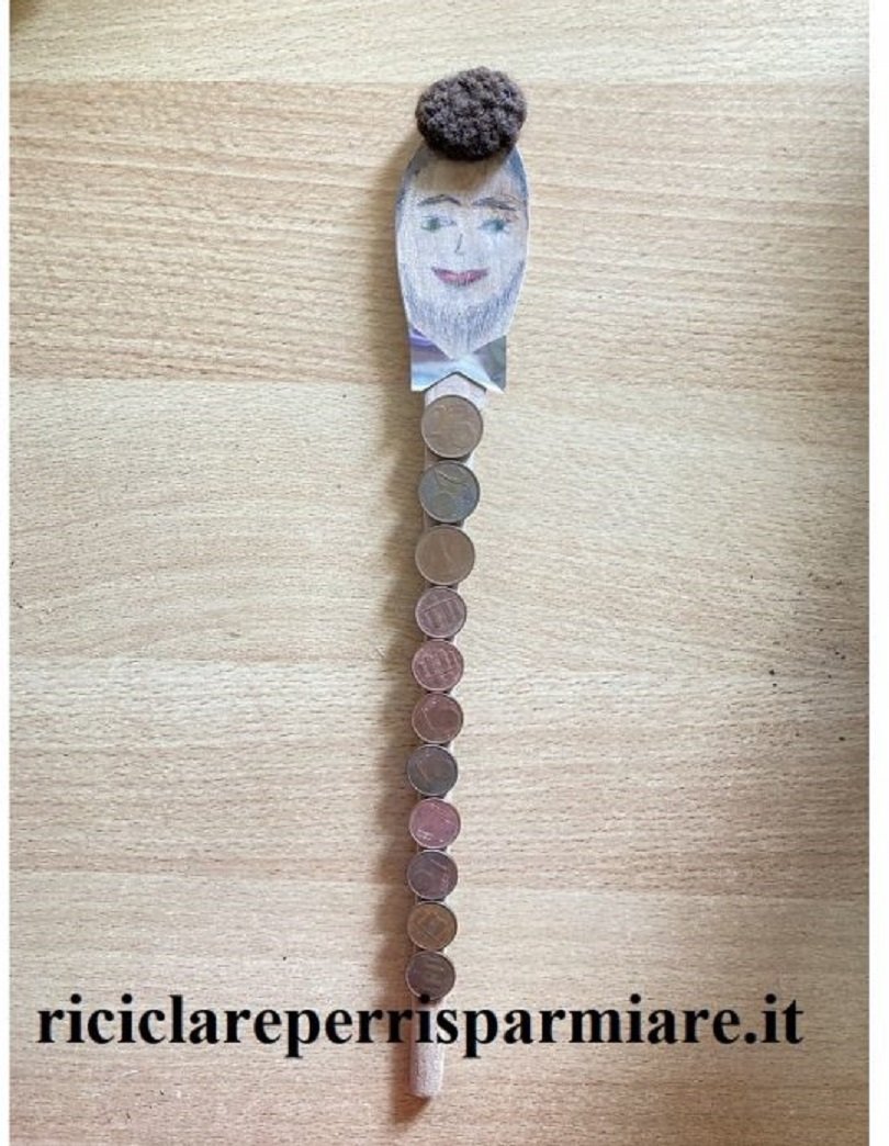 N. B. Ieri i miei piccoli creativi hanno manifestato la voglia di preparare un qualcosa per l’imminente festa del papà. Quindi ho disposto per loro un prototipo partendo da una posata di legno e alcuni centesimi. Poi loro stessi sceglieranno come decorare il proprio cucchiaio, nella maniera più confacente al gusto personale e sulla base dei decori in possesso.
