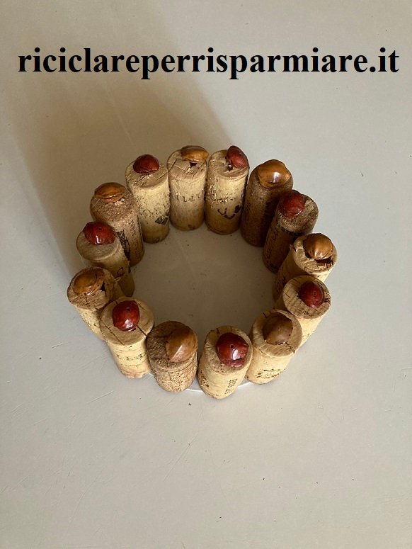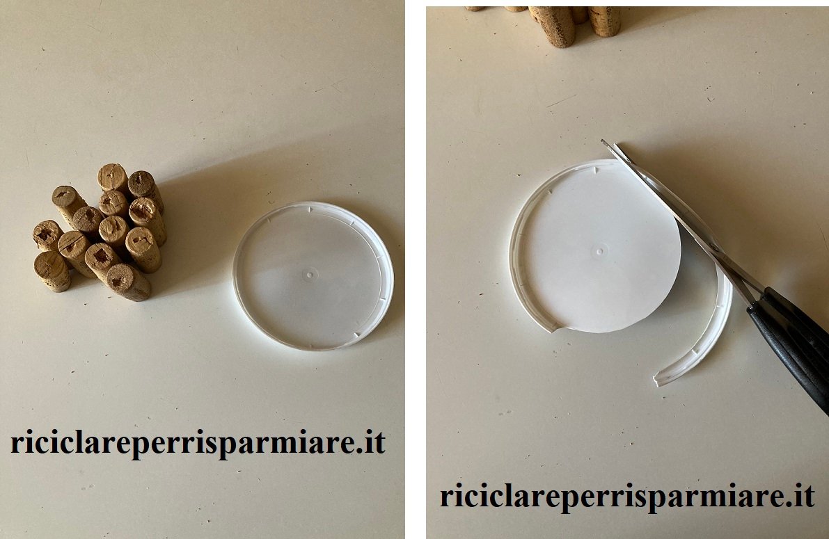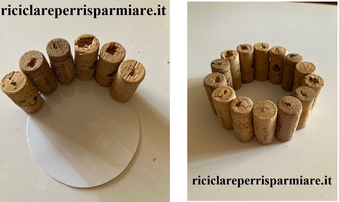 Creazione della Base: Prendi il cerchio di plastica (ad esempio, il coperchio di un barattolo di ricotta) e usalo come base del cestino. Disponi i tappi di sughero attorno al cerchio, poi incollandoli saldamente con la colla vinilica. Assicurati che gli incavi creati nei tappi siano rivolti verso l’alto.