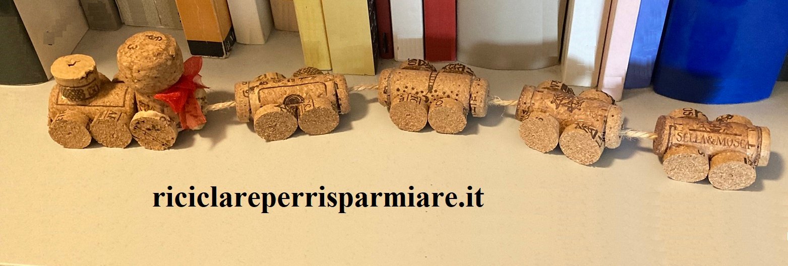 Assemblaggio: Prendi i tappi di sughero, bucali e trapassali con un filo di spago per formare il trenino. Forma la locomotiva con un tappo di spumante incollato ad uno del vino e crea i vagoni con gli altri.