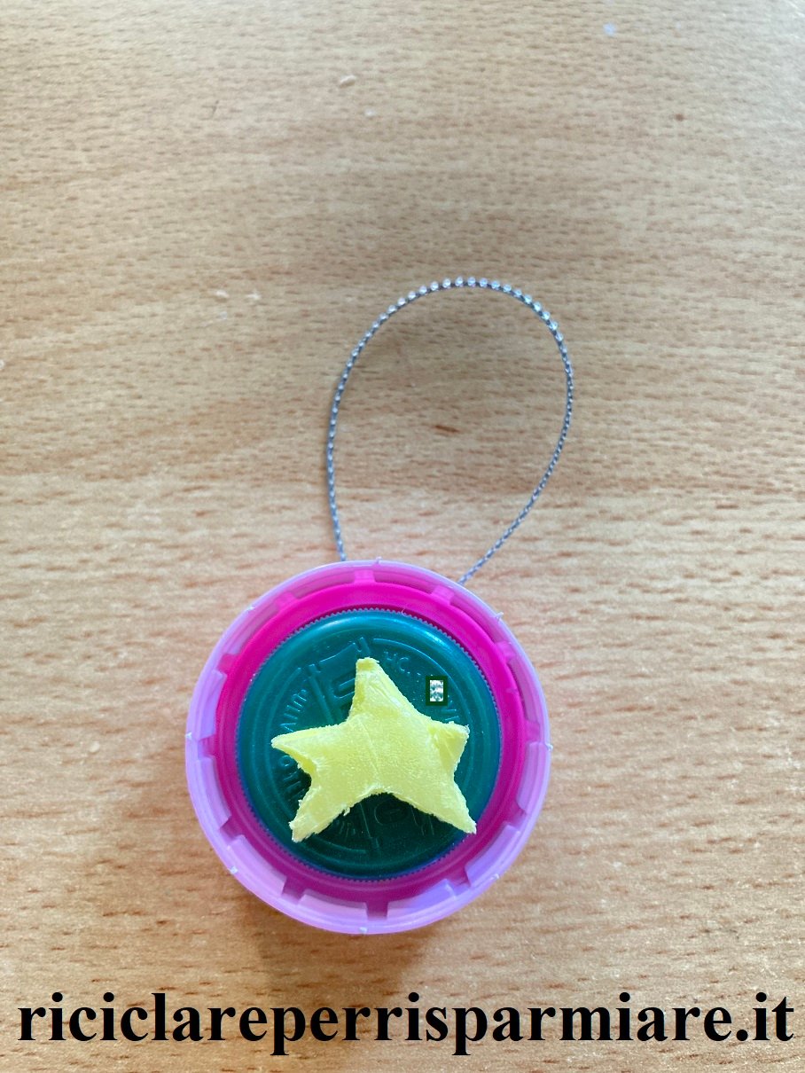 Dopo aver incollato i tappi, puoi applicare una stella e un cordoncino alla parte superiore del tappo più grande, per poterlo appende sull’Albero di Natale. Puoi anche verniciare il tuo decoro con uno spray del colore che preferisci, oppure ricoprirlo con un pezzo di alluminio prima di applicare la stella e il cordoncino.