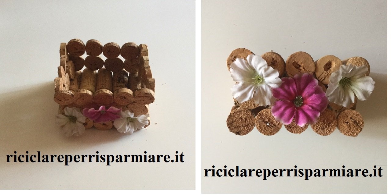 In primis crea la base con 10 tappi. Quindi incollali gli uni agli altri disponendoli su due file di cinque tappi ciascuna. Poi taglia i tappi rimanenti in orizzontale, creando così dei tondini.